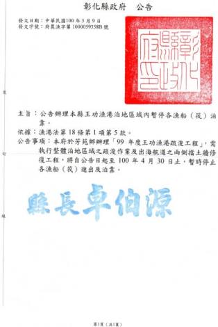 公告彰化縣王功漁港泊地區域內暫停各漁船(筏)泊靠